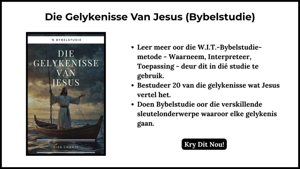 Een manier om te verseker dat jy gou ophou met Bybelstudie is om elke keer te wonder waar of wat jy volgende gaan studeer. Dit is waar ‘n Bybelstudieplan of studiegids van groot waarde is. As jy byvoorbeeld oor ‘n spesifieke onderwerp wil Bybelstudie doen, kan jy sommer ‘n Bybelleesplan, wat oor die onderwerp gaan, gebruik. Daar is ook baie verskillende studiegidse beskikbaar, wat jy kan gebruik. As jy op soek is na so ‘n studiegids, loer dan gerus na Die Gelykenisse Van Jesus Bybelstudie wat in ons aanlyn-winkel beskikbaar is.
